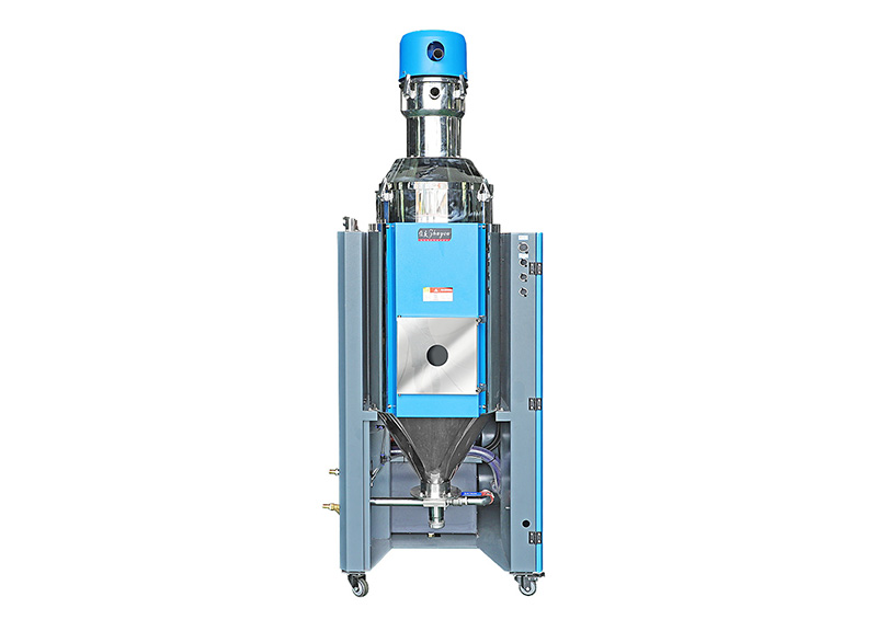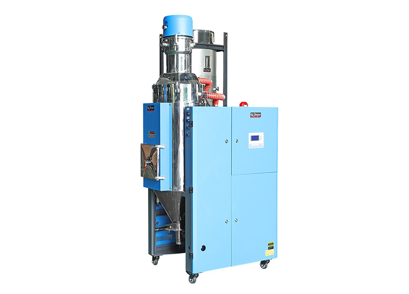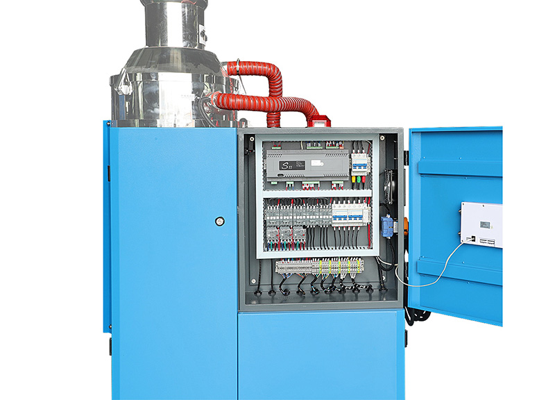 吸料部分:吸料是从储料桶或其它储料容器中吸入干燥料桶内,当真空料斗的磁簧开关侦测到无料时,吸料马达运转,使真空料斗内产生真空,储料 桶中的原料由于空气的压力差被吸入真空料斗内,当吸料时间完成后,吸料马逢停止运转,原料会因自重落入干燥料桶内经干燥后的原料从干燥料桶抽到安装在塑胶成型机的电眼料斗内或其它料斗内。